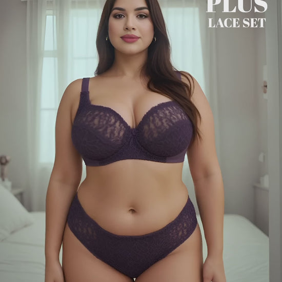Designed to flatter and support fuller busts, this plus-size lace bra and panty set is made from premium spandex and polyester, offering a soft stretch and breathable fit.