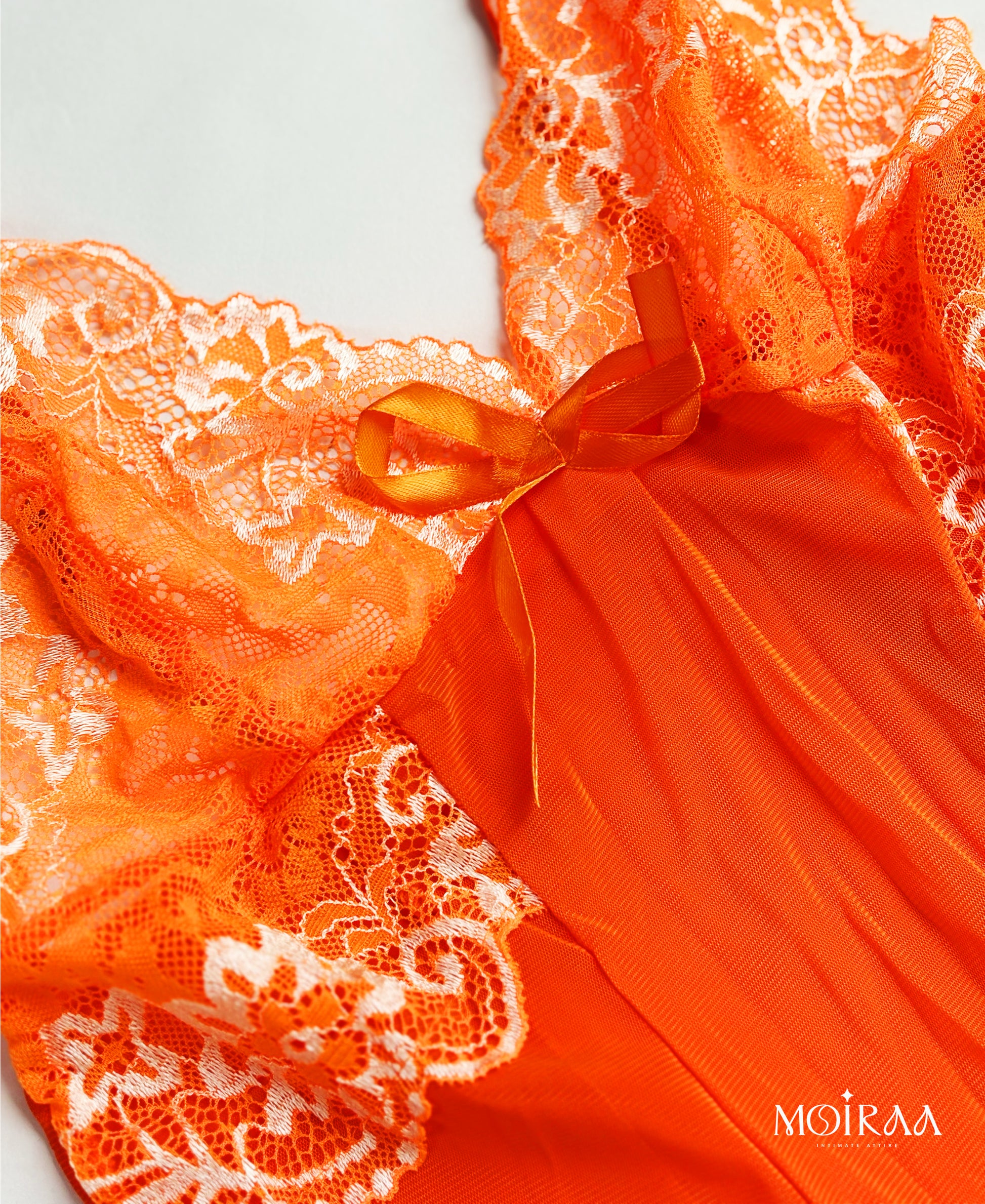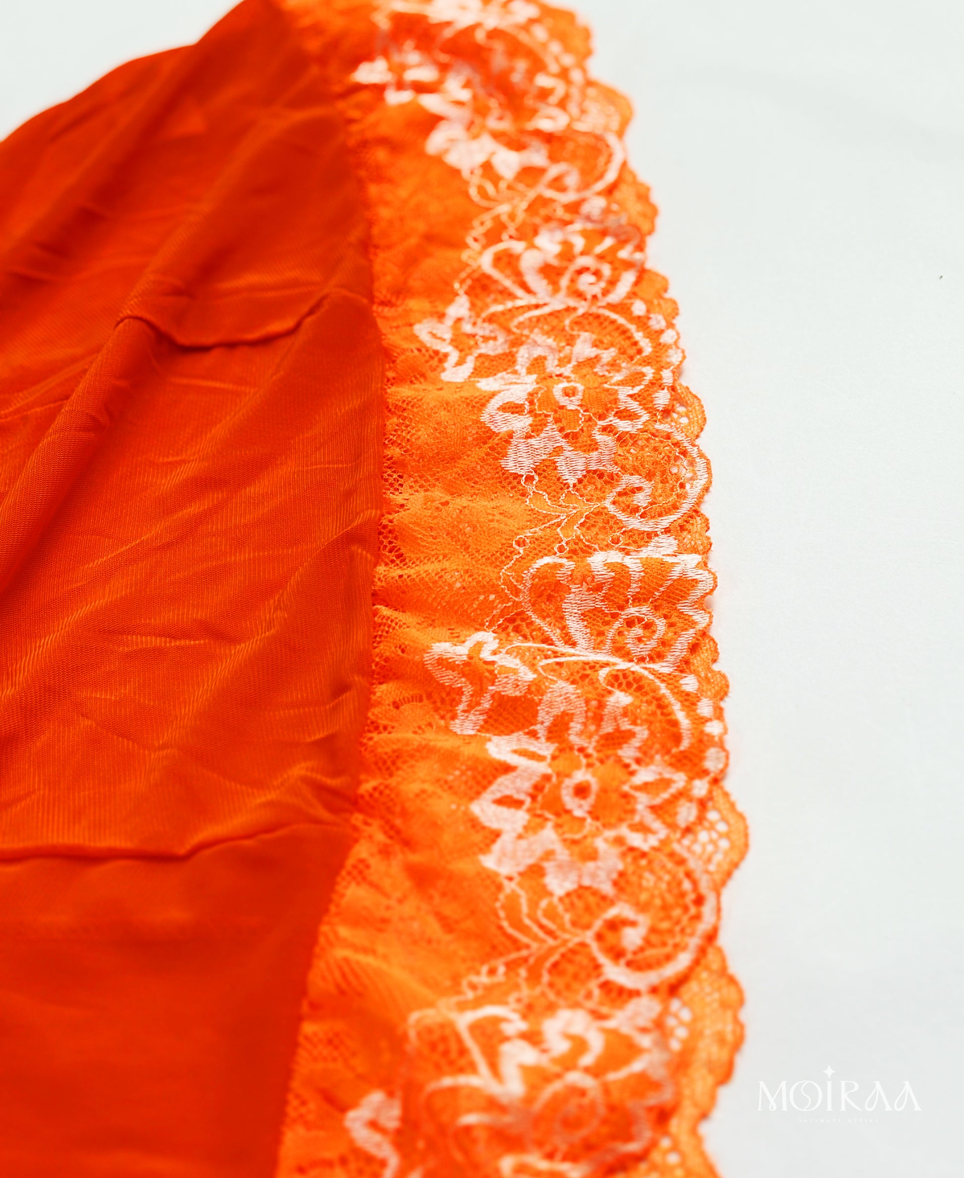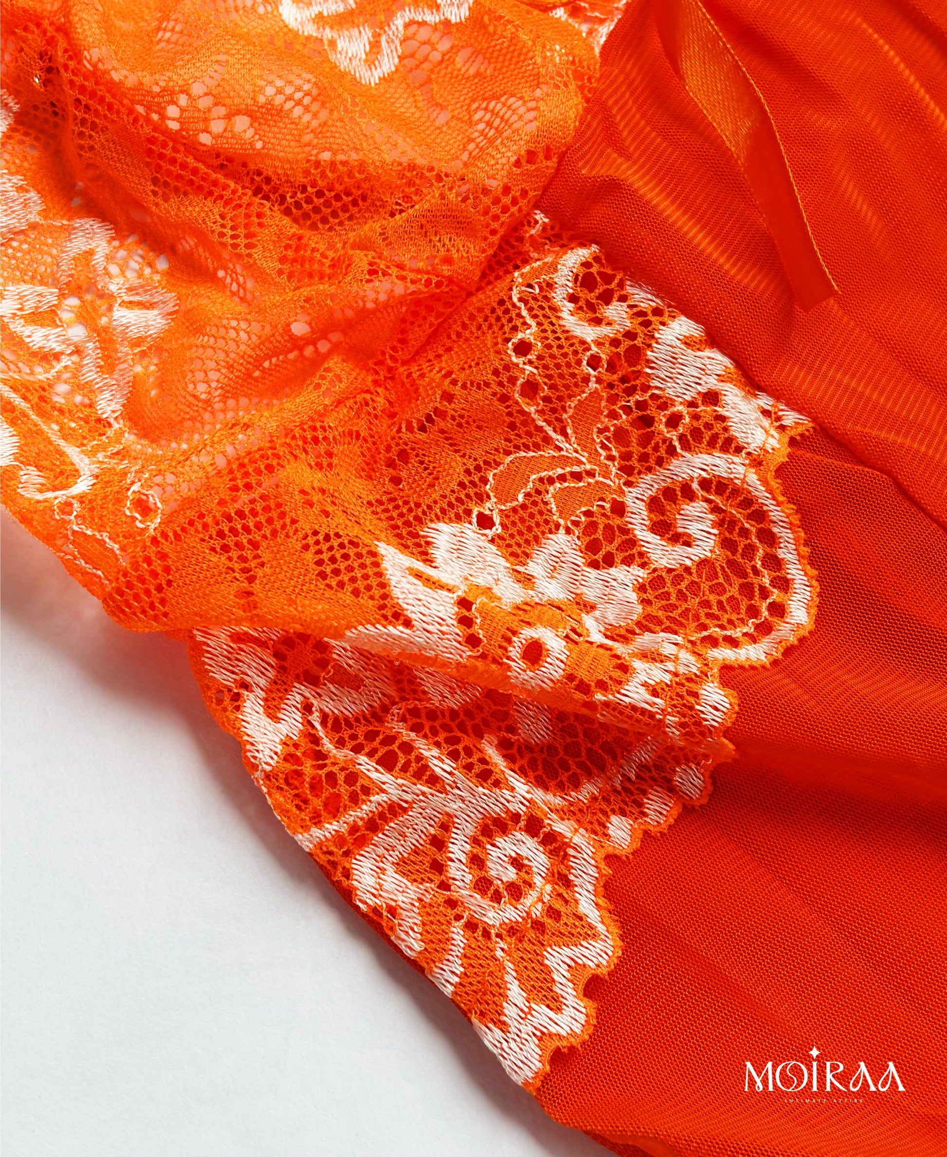 This Nightwear Set, designed to captivate and comfort. This stunning lingerie features a vibrant orange hue, soft knit fabric, and is delicately adorned with contrast white lace detailing for that irresistible touch of sophistication. The matching thong panty completes the alluring look.
