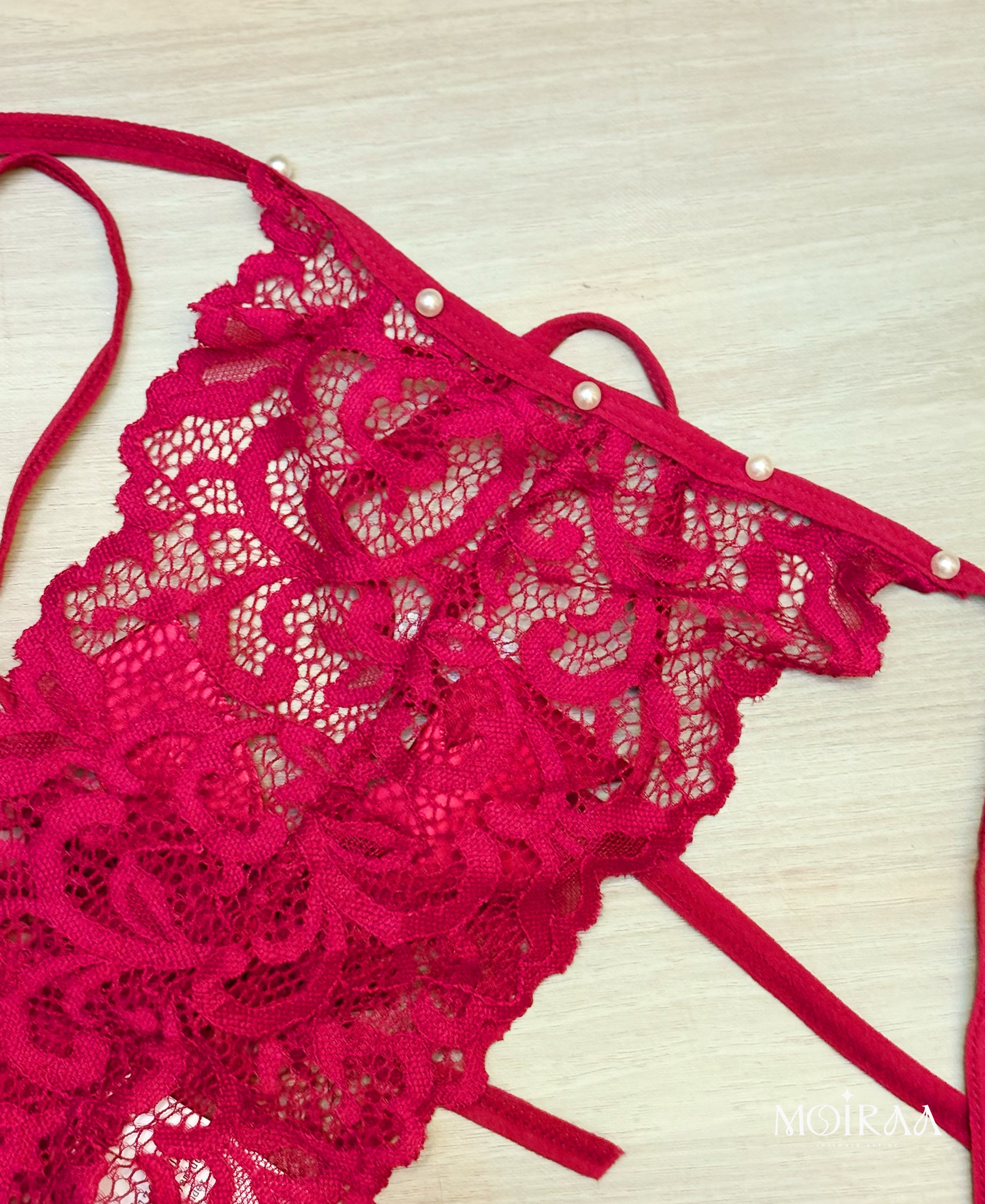 Unleash your inner allure with the Talia Monroe thong panty — a captivating mix of delicate detail and daring design. Crafted from soft, semi-sheer lace, this piece enhances your natural silhouette while adding a luxurious touch with pearl-studded accents. The adjustable bow-tie sides offer a personalized fit and a beautifully feminine finish.